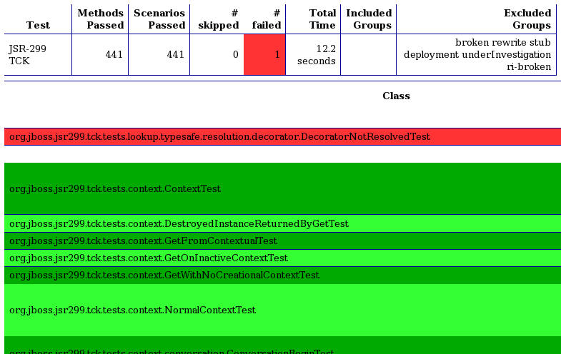 As you by now, the CDI TCK test suite is really just a TestNG test suite. That means an execution of the CDI TCK test suite produces all the same reports that TestNG produces. This section will go over those reports and show you were to go to find each of them.