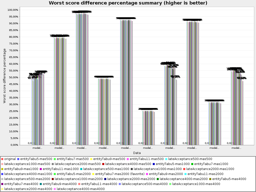 | entityTabu5-mas1000 10 | 0hard/-185871870soft 22 | 0hard/-6047885soft 10 | 0hard/-18068827soft 18 | 0hard/-18640soft 16 | 0hard/-1379998soft 25 | 0hard/-4340soft 18 | 0hard/-230381818soft 11 | 0hard/-64492soft 15 | 0hard/-56696soft 23 | 0hard/-157967561soft 13 | 0hard/-59986213soft |