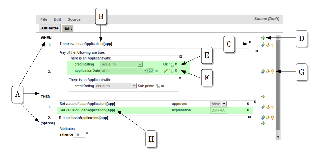 C : The "minus" icon ("[-]") indicates you can remove something. In this case it would remove the whole "LoanApplication" fact declaration. Depending upon the placement of the icon different components of the rule declaration can be removed, for example a Fact Pattern, Field Constraint, other Conditional Element ("exists", "not exists", "from" etc) or an Action.