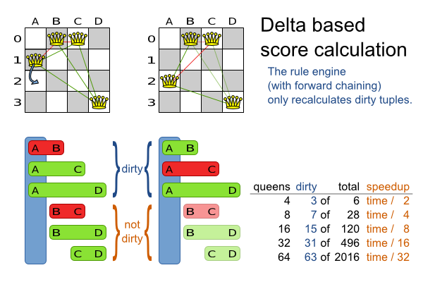 full score calculation on each solution evaluation. For example, if a single queen A moves from y