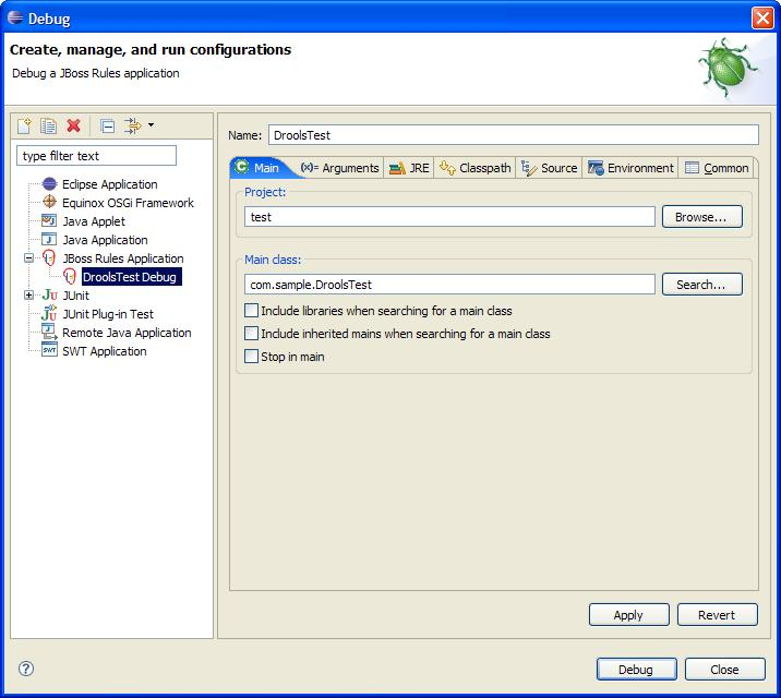 Click the "Debug" button on the bottom to start debugging your application. You only have to define your debug configuration once. The next time you run your Drools application, you don't have to create a new one but select the previously defined one in the tree on the left, as a sub-element of the "Drools Application" tree node, and then click the Debug button. The Eclipse toolbar also contains shortcut buttons to quickly re-execute one of your previous configurations (at least when one of the Java, Java Debug, or Drools perspectives has been selected).
