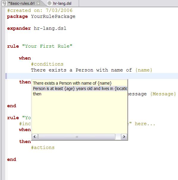 The rule editor is where rule managers and developers will be spending most of their time. The rule editor follows the pattern of a normal text editor in Eclipse, with all the customary features of a text editor. On top of this, the rule editor provides pop-up content assistance. You invoke pop-up content assistance the "normal" way by pressing Control+Space.