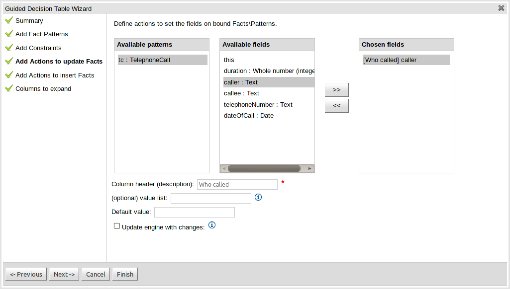 'Fact.field[dependentField1, dependentField2]' : '(new com.yourco.DataHelper()).getListOfAges("@{dependentField1}", "@{dependentField2}")'Similar to above, but note that we have just specified what fields are needed, and also on the right of the ":" there are quotes around the expression. This expression will then be evaluated, only when needed, substituting the values from the fields specified. This means you can use the field values from the GUI to drive a database query, and drill down into data etc. When the drop down is loaded, or the rule loaded, it will refresh the list based on the fields. 'depenentField1' and 'dependentField2' are names of fields on the 'Fact' type - these are used to calculate the list of values which will be shown in a drop down if values for the "field".