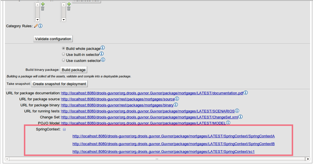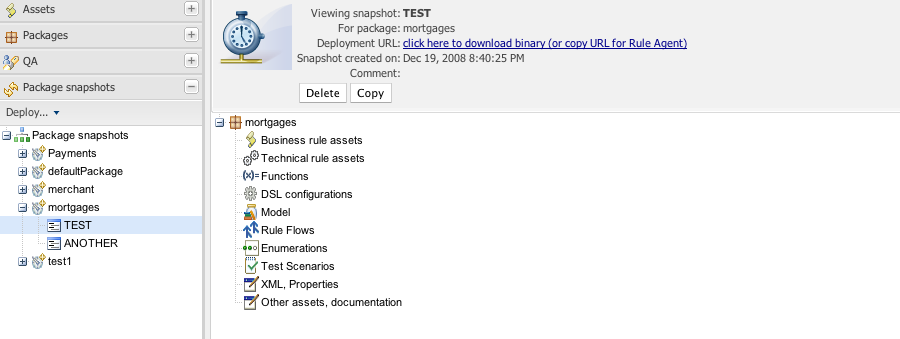 You can also take a "snapshot" of a package for deployment. This freezes the package at that point in time, so any concurrent changes to not effect the package. It also makes the package available on a URL of the form: "http://<your server>/guvnor-webapp/org.drools.guvnor.Guvnor/packages/<packageName>/<snapshotName>" (where you can use that URL and downloads will be covered in the section on deployment).