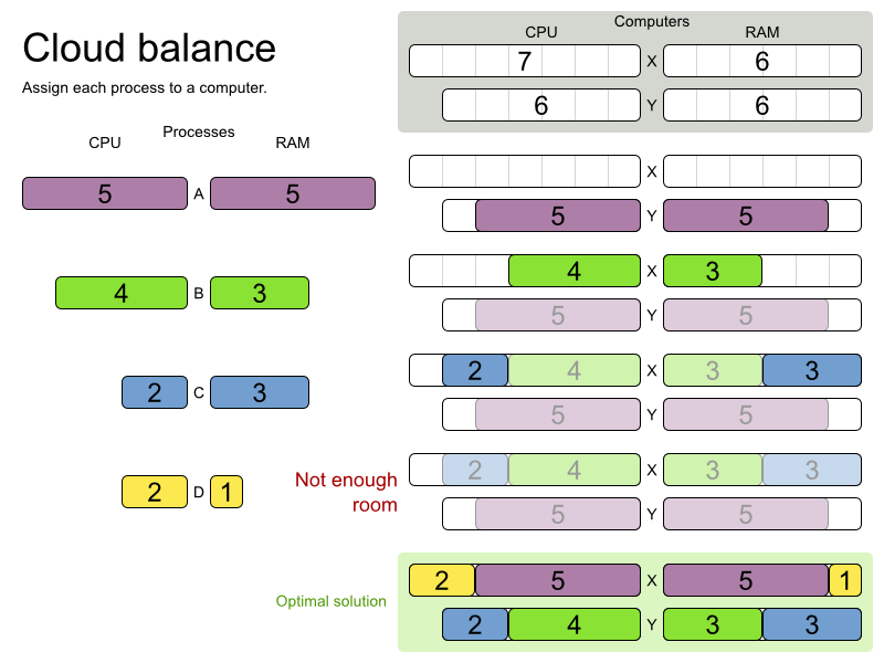 How would you do that? This problem is a form of bin packing. Here's a simplified example where we assign 4 processes to 2 computers with 2 constraints (CPU and RAM) with a simple algorithm: