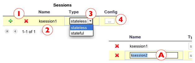 Sessions Grid: Here users can create, delete and edit in place a list of desires ksessions. For detailed instructions on how to configure ksessions, please check the "Configuring Knowledge Sessions" section.
