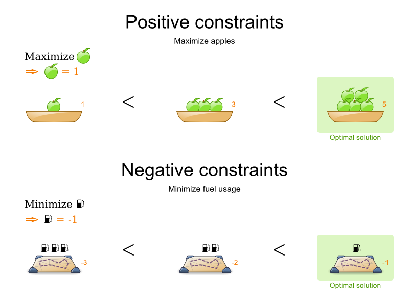 These constraints define the score calculation (AKA fitness function) of a planning problem. Each solution of a planning problem can be graded with a score. With Planner, score constraints are written in an Object Orientated language, such as Java code or Drools rules. Such code is easy, flexible and scalable.