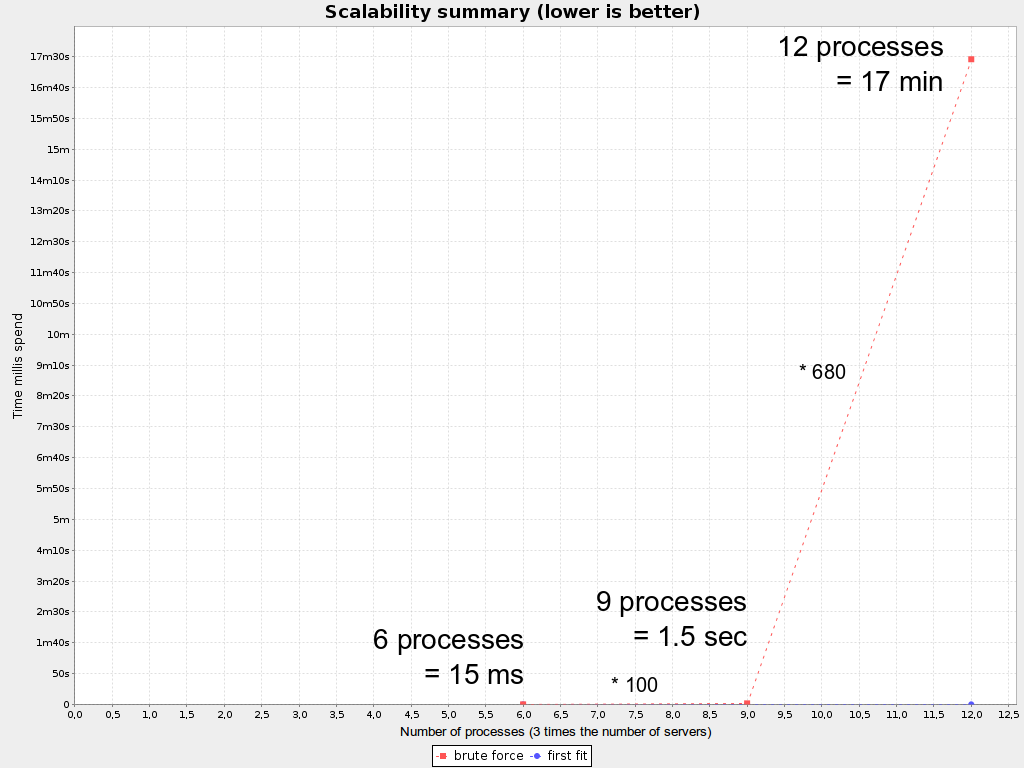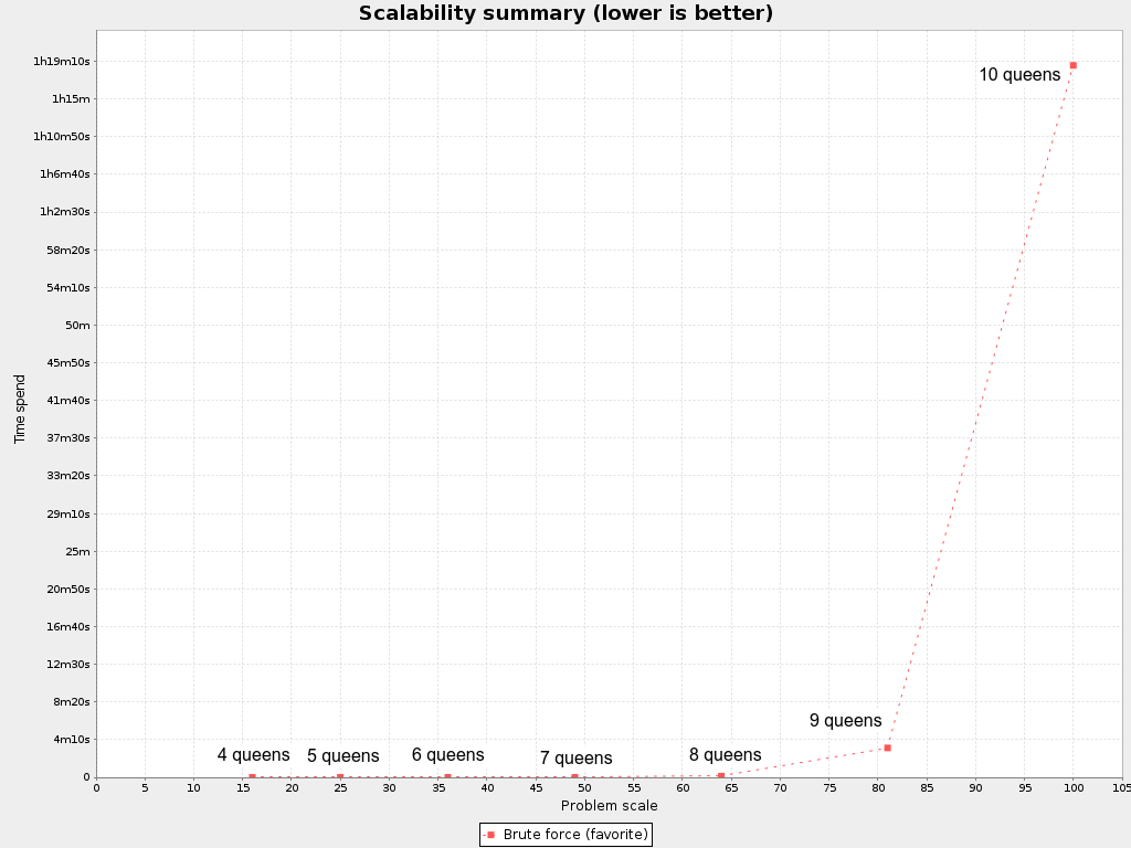 Notice that it creates a search tree that explodes as the problem size increases. Brute Force is mostly unusable for a real-world problem due to time limitations, as proven by these scalability graphs from the benchmarker: