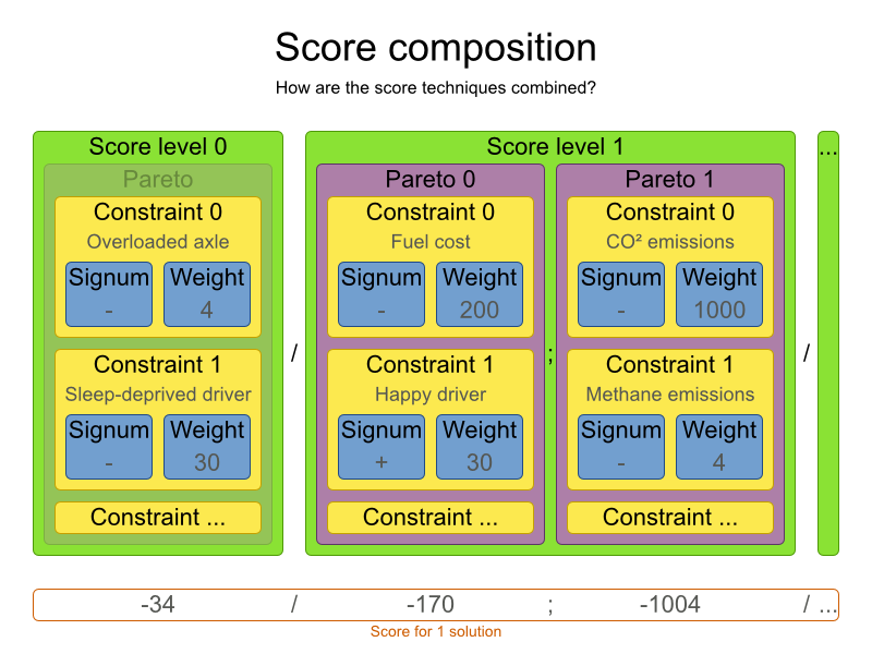 Far less common is the use case of pareto optimization, which is also known under the more confusing term multi-objective optimization. In pareto scoring, score constraints are in the same score level, yet they are not weighted against each other. When 2 scores are compared, each of the score constraints are compared individually and the score with the most dominating score constraints wins. Pareto scoring can even be combined with score levels and score constraint weighting.