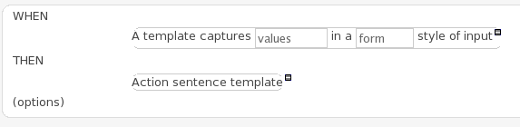 If the package the rule is part of has a DSL configuration, when when you add conditions or actions, then it will provide a list of "DSL Sentences" which you can choose from - when you choose one, it will add a row to the rule - where the DSL specifies values come from a user, then a edit box (text) will be shown (so it ends up looking a bit like a form). This is optional, and there is another DSL editor. Please note that the DSL capabilities in this editor are slightly less then the full set of DSL features (basically you can do [when] and [then] sections of the DSL only - which is no different to drools 3 in effect).