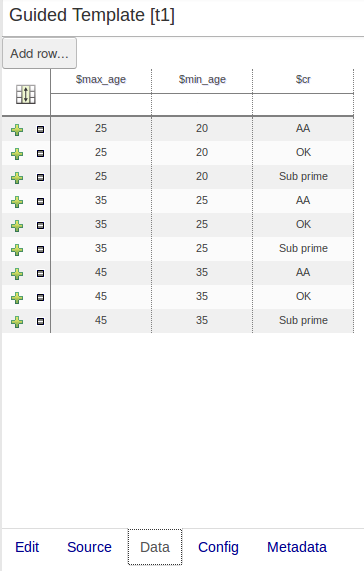 When you have completed the definition of your rule template you need to enter the data that will be used to interpolate the "Template Key" place-holders. Drools Workbench provides the facility to enter data in a flexible grid within the guided editor screen. The data entry section is located on the Data tab within the editor.