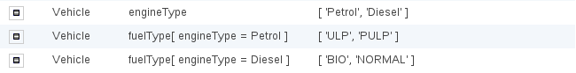 Drop down lists that depend on field values: Lets imagine a simple fact model, we have a class called Vehicle, which has 2 fields: "engineType" and "fuelType". We want to have a choice for the "engineType" of "Petrol" or "Diesel". Now, obviously the choice type for fuel must be dependent on the engine type (so for Petrol we have ULP and PULP, and for Diesel we have BIO and NORMAL). We can express this dependency in an enumeration as: