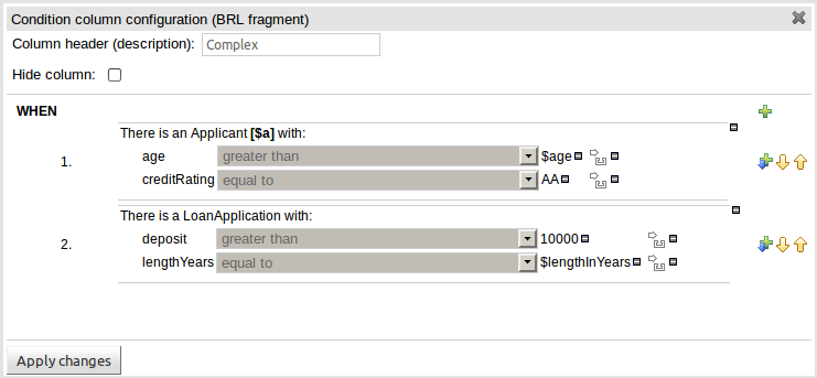 C : The "minus" icon ("[-]") indicates you can remove something. In this case it would remove the whole "LoanApplication" fact declaration. Depending upon the placement of the icon different components of the rule declaration can be removed, for example a Fact Pattern, Field Constraint, other Conditional Element ("exists", "not exists", "from" etc) or an Action.