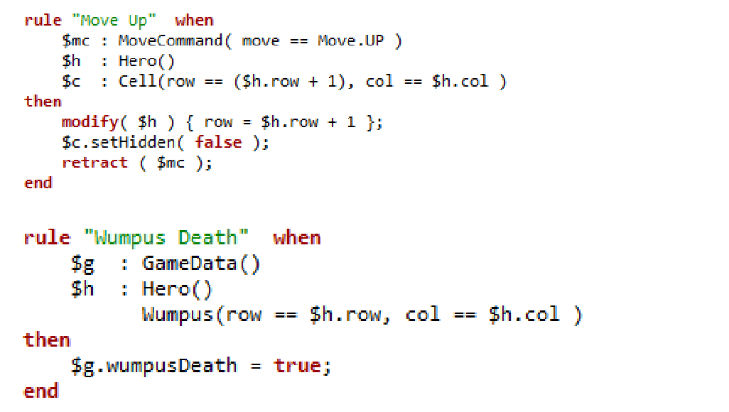 The RHS (after then) or consequence part of the rule is written using the MVEL expression