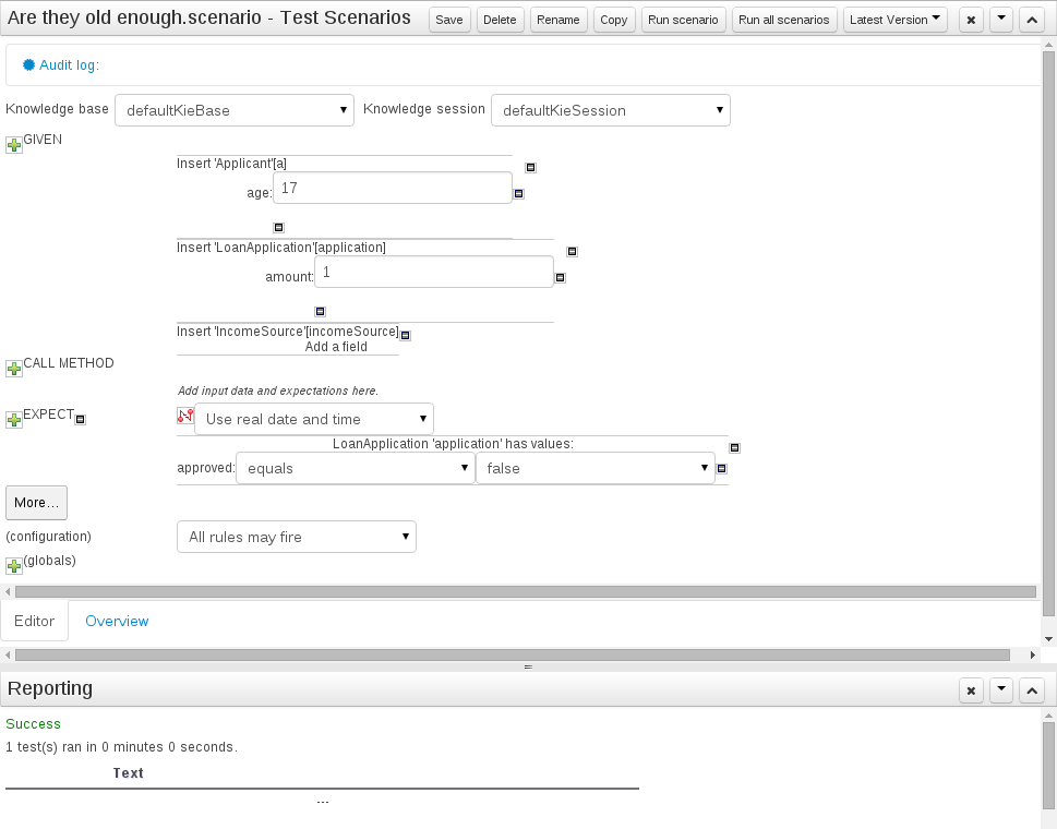 Given section lists the facts needed for the behaviour. Expect section lists the expected changes and actions done by the behaviour. Given facts are passed for the Test Scenario before execution. During the rule execution, changes in the knowledge base are recorded. After the execution ends the recorded actions, existing facts in the knowledge base and knowledge base output is compared against the expectations.
