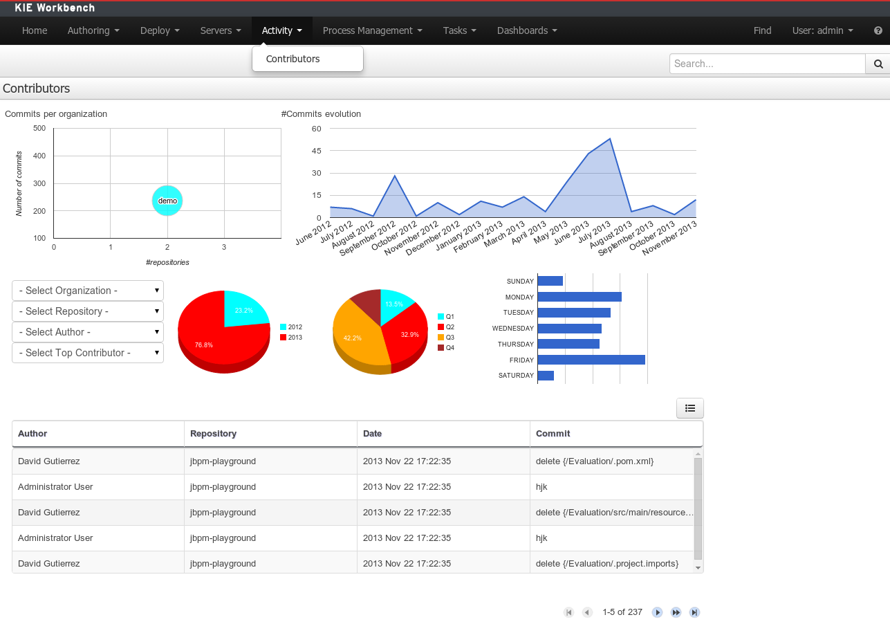 The workbench has had a big overhaul using a new base project called UberFire. UberFire is inspired by Eclipse and provides a clean, extensible and flexible framework for the workbench. The end result is not only a richer experience for our end users, but we can now develop more rapidly with a clean component based architecture. If you like he Workbench experience you can use UberFire today to build your own web based dashboard and console efforts.