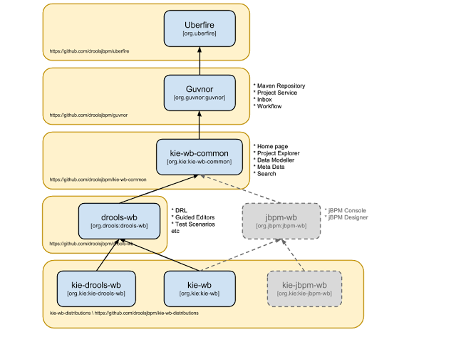 The Guvnor brand leaked too much from its intended role; such as the authoring metaphors, like Decision Tables, being considered Guvnor components instead of Drools components. This wasn’t helped by the monolithic projects structure used in 5.x for Guvnor. In 6.0 Guvnor 's focus has been narrowed to encapsulates the set of UberFire plugins that provide the basis for building a web based IDE. Such as Maven integration for building and deploying, management of Maven repositories and activity notifications via inboxes. Drools and jBPM build workbench distributions using Uberfire as the base and including a set of plugins, such as Guvnor, along with their own plugins for things like decision tables, guided editors, BPMN2 designer, human tasks.