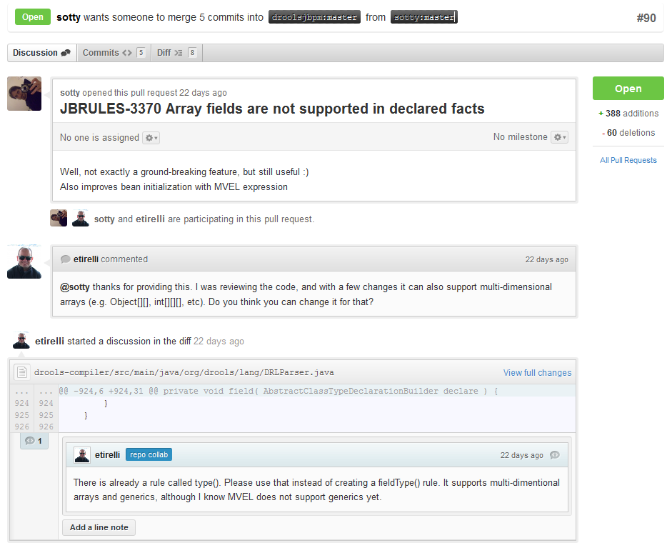 The pull request then goes into a queue for everyone to see and comment on. Below you can see a typical pull request. The pull requests allow for discussions and it shows all associated commits and the diffs for each commit. The discussions typically involve code reviews which provide helpful suggestions for improvements, and allows for us to leave inline comments on specific parts of the code. Don’t be disheartened if we don’t merge straight away, it can often take several revisions before we accept a pull request. Luckily GitHub makes it very trivial to go back to your code, do some more commits and then update your pull request to your latest and greatest.