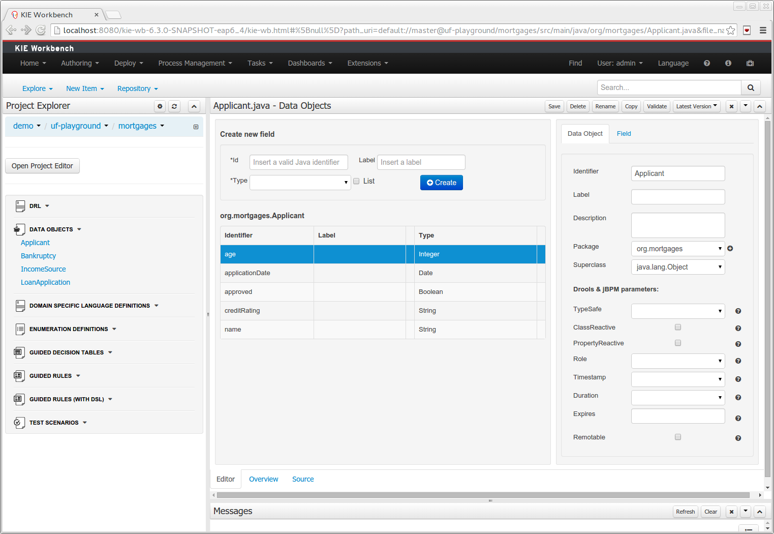 New Data Modeller replaces the declarative Fact Model Editor; bringing authoring of Java classes to the authoring environment. Java classes are packaged into the project and can be used within rules, processes etc and externally in your own applications.