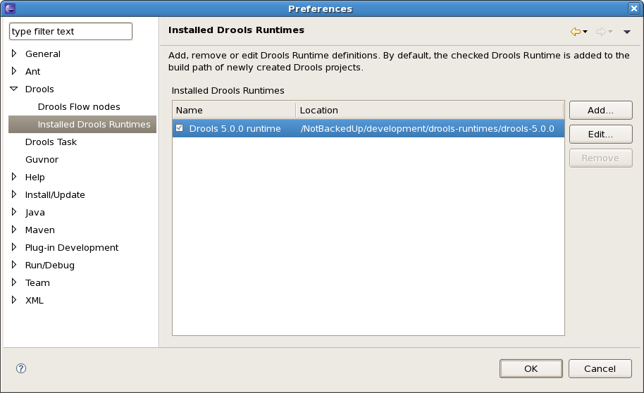 A Drools runtime is a collection of JARs on your file system that represent one specific release of the Drools project JARs. To create a runtime, you must point the IDE to the release of your choice. If you want to create a new runtime based on the latest Drools project JARs included in the plugin itself, you can also easily do that. You are required to specify a default Drools runtime for your Eclipse workspace, but each individual project can override the default and select the appropriate runtime for that project specifically.