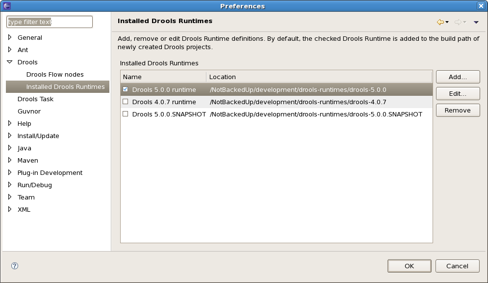 A Drools runtime is a collection of JARs on your file system that represent one specific release of the Drools project JARs. To create a runtime, you must point the IDE to the release of your choice. If you want to create a new runtime based on the latest Drools project JARs included in the plugin itself, you can also easily do that. You are required to specify a default Drools runtime for your Eclipse workspace, but each individual project can override the default and select the appropriate runtime for that project specifically.