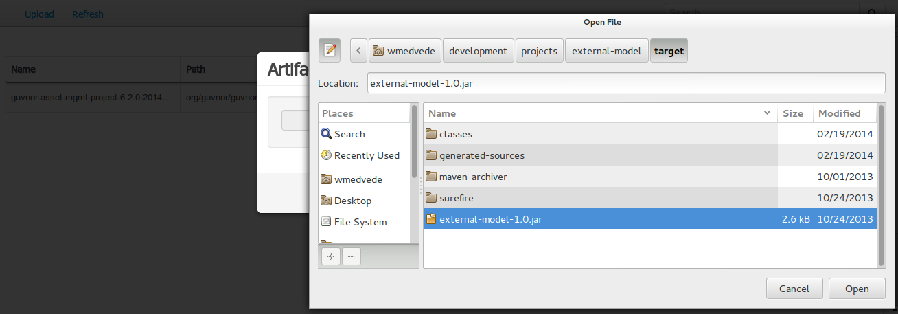 Projects can be built with Maven and installed to the local M2_REPO or remote Maven repositories. Maven is then used to declare and build the classpath of dependencies, for KIE to access.