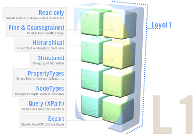 Level 1 includes read-only functionality for very simple repositories. It is useful to port an existing data repository and convert it to a more advanced form step by step. JCR uses a well-known Session abstraction to access the repository data (similar to the sessions we have in OS, web, etc).