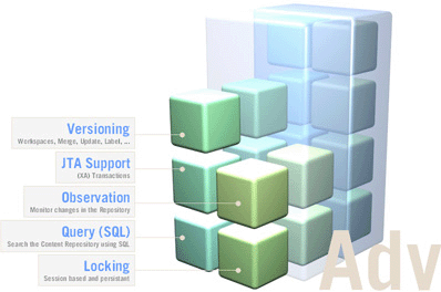 On the top of Level 1 or Level 2, a number of optional features are defined for a more advanced repository functionality. This includes functions such as Versioning, (JTA) Transactions, Query using SQL, Explicit Locking and Content Observation. eXo JCR supports all optional features.