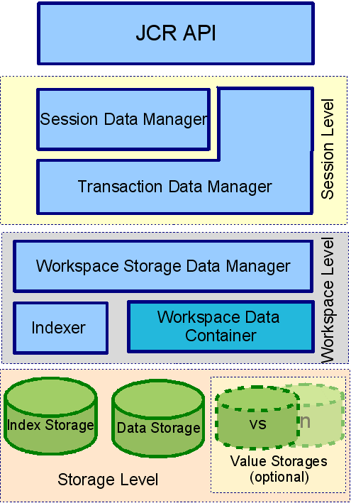 Workspace Data Container: implements physical data storage. It allows different types of backend (like RDB, FS files, etc) to be used as a storage for JCR data. With the main Data Container, other storages for persisted Property Values can be configured and used.