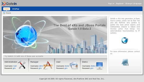 GateIn comes from a merge of two mature projects; the JBoss Portal and the eXo Portal. It takes the best of both into a single new project. The aim is to provide both an intuitive portal to use as-is and a portal framework to build upon depending on your needs.