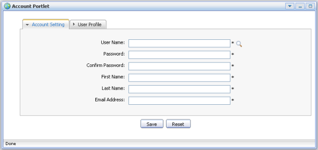 The Account Portlet allows users to register a new account and choose a preferred language for displaying the Portal interface.