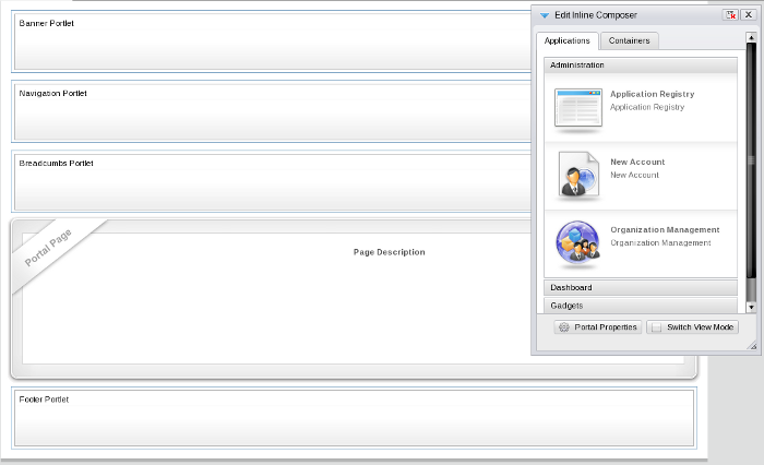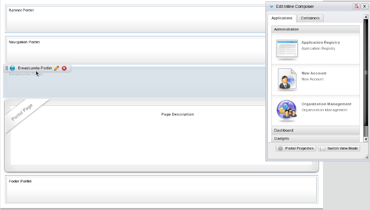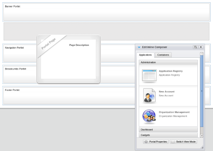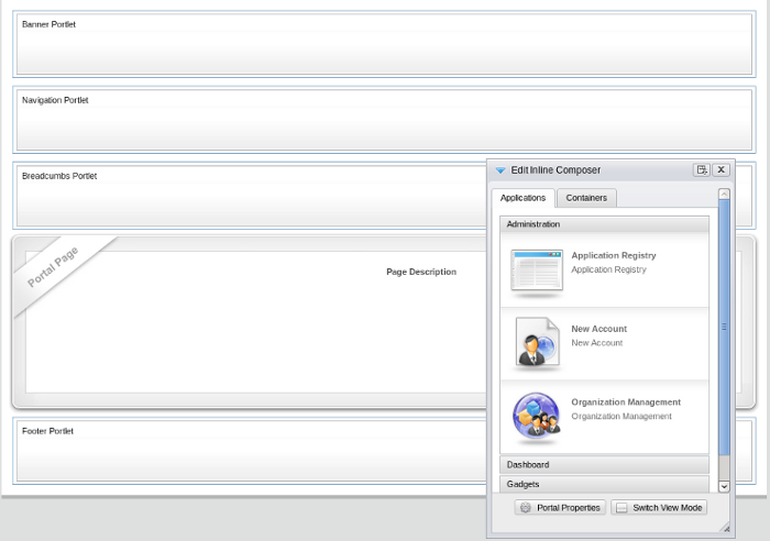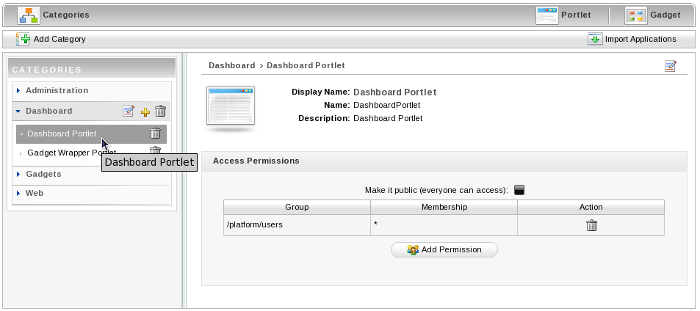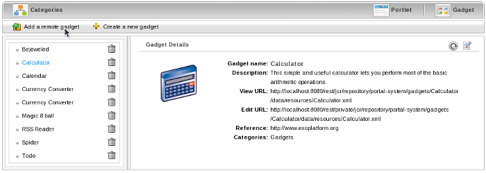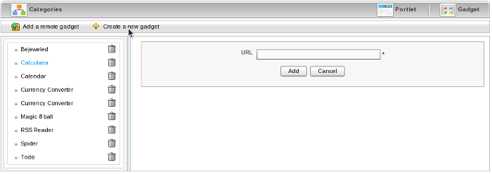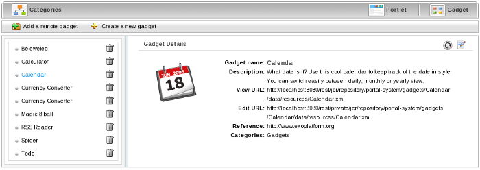 Portlets and gadgets are organized in different categories. Each category contains one or several portlets or gadgets. You can also mix portlets and gadgets into one category. By default all gadgets are placed in the Gadgets category.