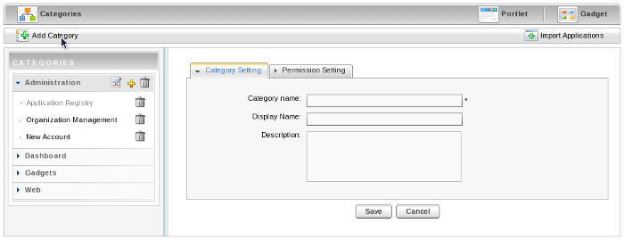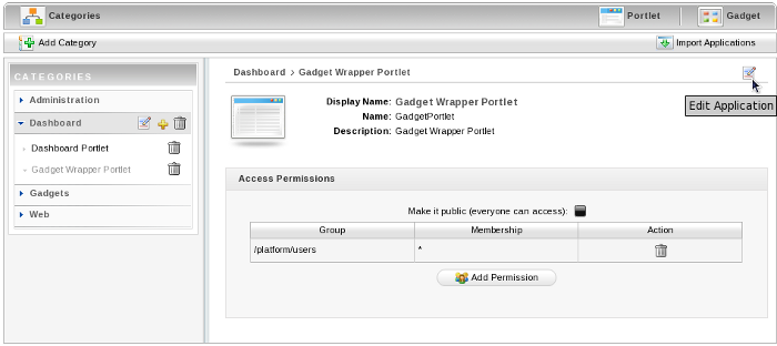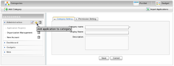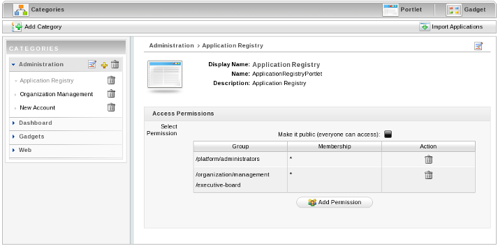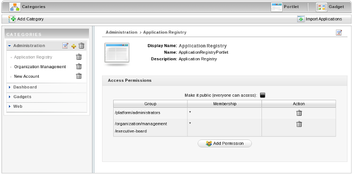 The Application Registry Portlet is used to manage different application categories. You can add, edit, set permissions and delete a category and its applications.