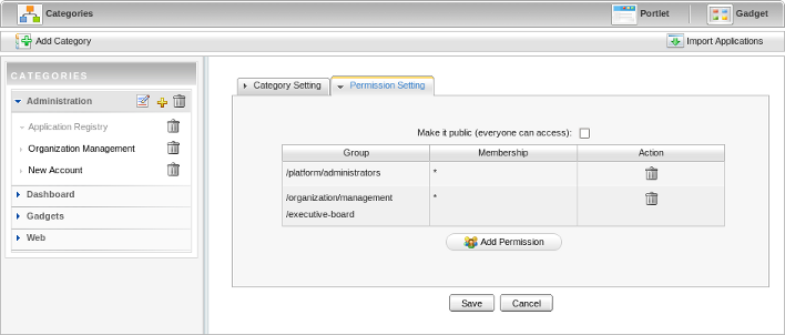 Click the Save button to add the selected portlet/gadget to the category.