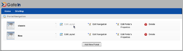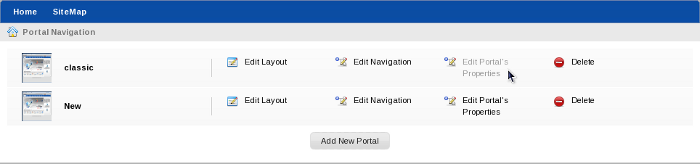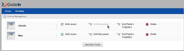 This navigation contains links to add a new pages to the portal, to edit a page or to change the portal's layout. Administrators can use these links to manage the portal.