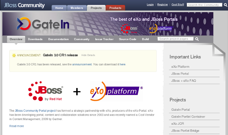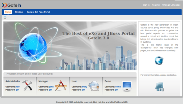 GateIn 3.0 is the merge of two mature Java projects; JBoss Portal and eXo Portal. This new community project takes the best of both offerings and incorporates them into a single j2ee deployment archive. The aim is to provide an intuitive user-friendly portal and a framework to address the needs of today's Web 2.0 applications.