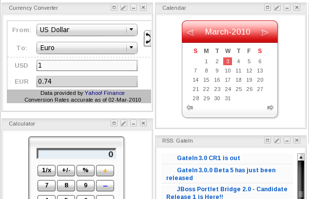 Many more gadgets can be found at Google Gadgets. GateIn 3.0 is compatible with most of the gadgets available there.
