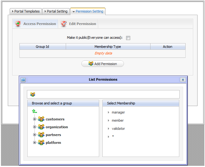 This permission type allows users to utilize portal content, that is; sign in, rearrange portlets, etc. This permission can be set for multiple member groups.