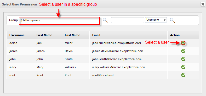 Enter a group name in the Group field at the top of the form (for example, /platform/users). Then press Enter. All users in the nominated group will be displayed.