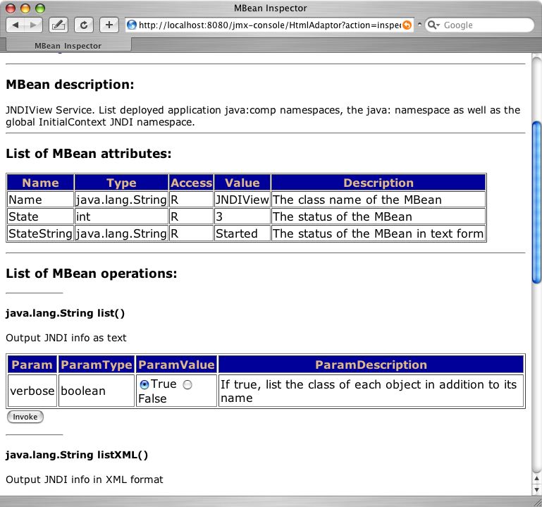 Selecting the JNDIView link takes you to the JNDIView MBean view, which will have a list of the JNDIView MBean operations. This view should look similar to that shown in Figure 4.5, “The JMX Console view of the JNDIView MBean”.
