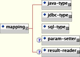 A type-mapping is simply a set of mappings between Java class types and database types. A set of type mappings is defined by a set of mapping elements, the content model for which is shown in Figure 12.19, “The jbosscmp-jdbc mapping element content model.”.