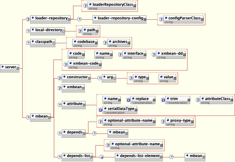 The SARDeployer handles services archives. A service archive can be either a jar that ends with a .sar suffix and contains a META-INF/jboss-service.xml descriptor, or a standalone XML descriptor with a naming pattern that matches *-service.xml. The DTD for the service descriptor is jboss-service_5.0.dtd and is shown in Figure 3.15, “The DTD for the MBean service descriptor parsed by the SARDeployer”.
