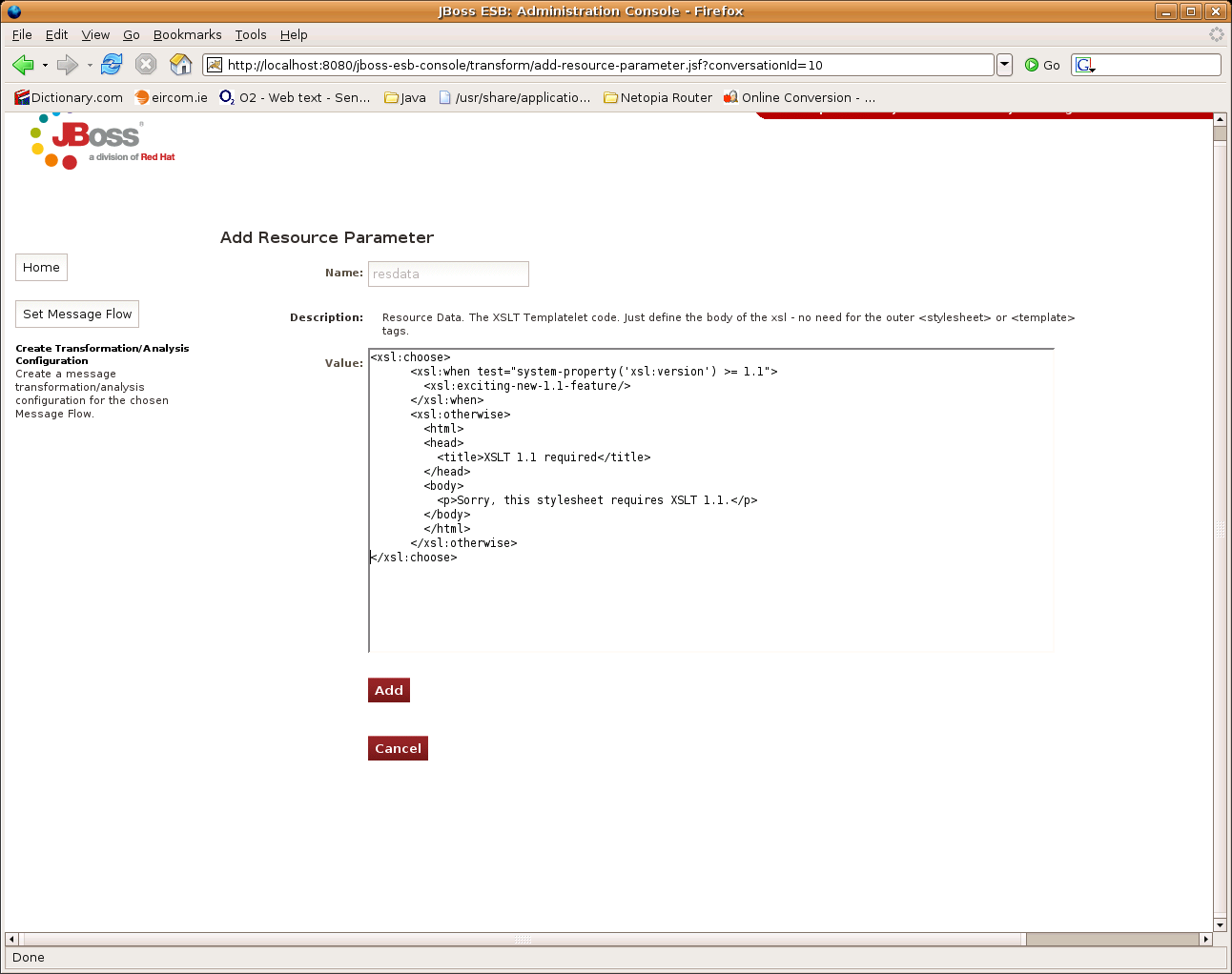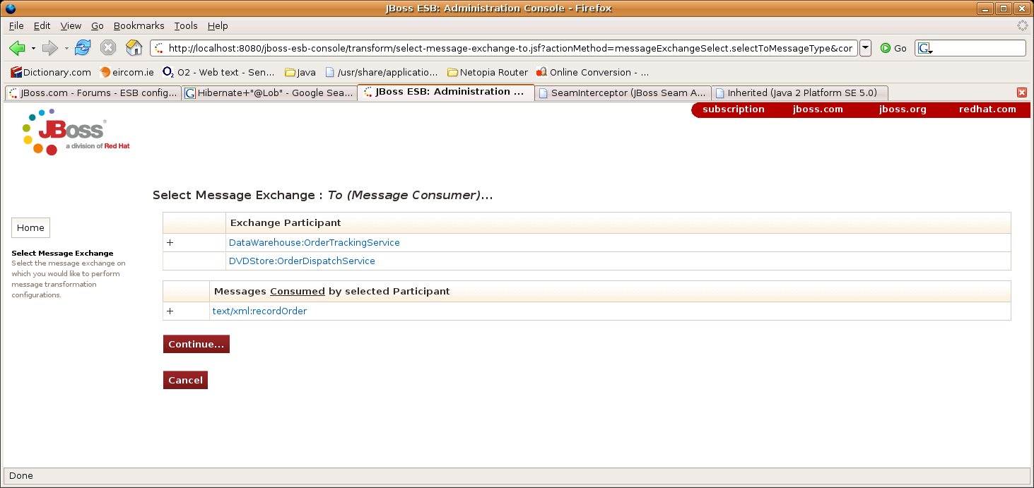 We are now ready to add the XSLT Transform and target it at the message fragment on the Message Exchange. We do this through the “Configure New Resource” wizard. At this point however, we haven't set the active Message Exchange for the browser session. To do this simply click on the link to access the “Configure New Resource” wizard. You'll notice that instead of this wizard being shown, you will be redirected to set the Message Exchange for the browser session. Just click your way through the screens to select the message exchange we wish to target (click the links and then press the “Continue..” button):