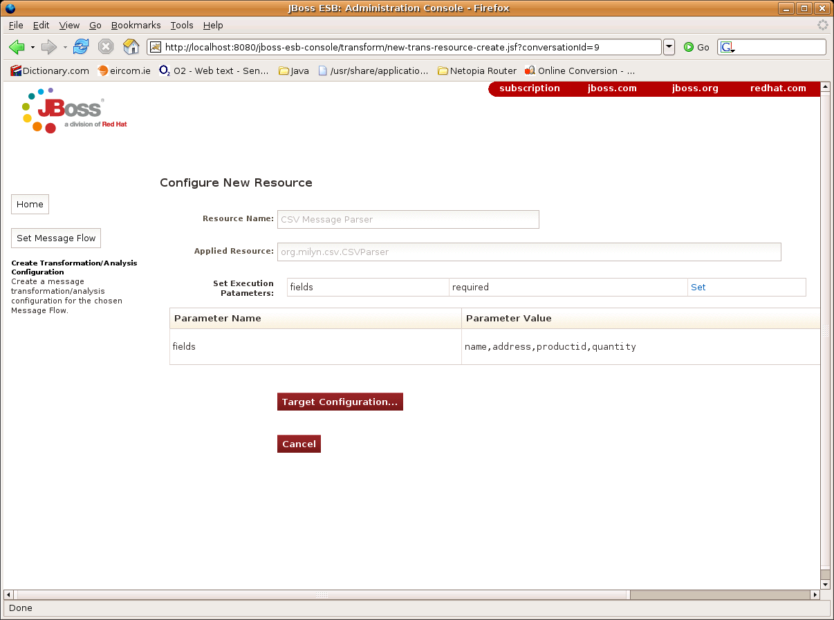 After adding both Execution Parameters, press the “Target Configuration...” button and move on to the “Target New Resource Configuration” form. This time you'll notice that the “Execution Selector” field is empty and needs to be populated. We want to target this XSL Transformation resource at the root the CSV Order DOM i.e. the “csv-set” element: