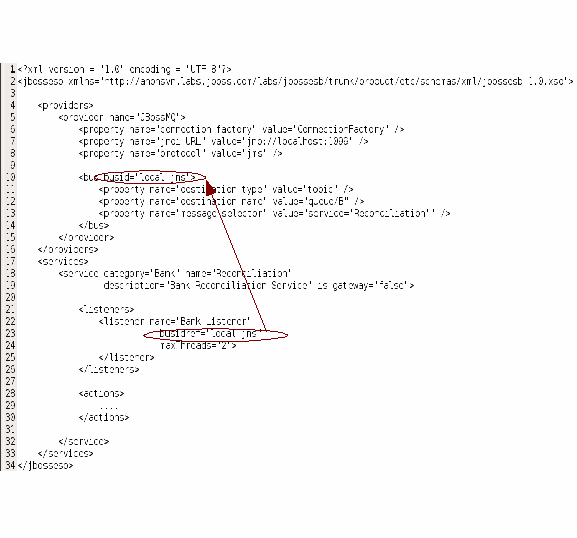 7This JMS example is only for demonstration purposes. We recommend that people use the more strongly typed JMS specific extensions of <provider> and <bus> i.e. <jms-provider> and <jms-bus>.
