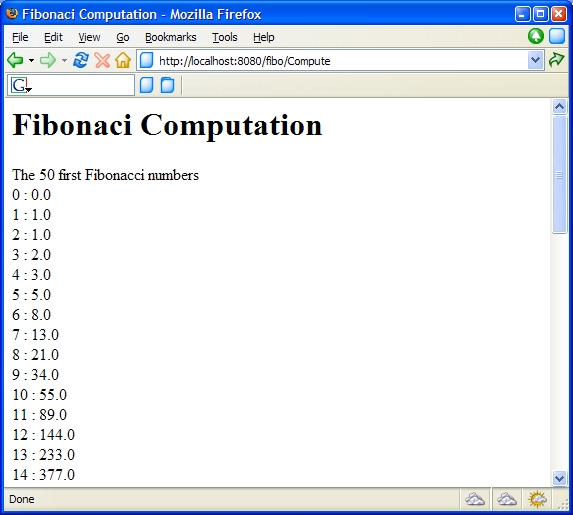 Open a web browser and type http://localhost:8080/fibo/. The host/port can change if the web server listens on another host/port. You should see a simple form like the one above. Enter a positive value in the field and press Compute.
