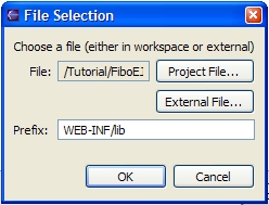 To add the standard Web deployment descriptor, select the FiboWeb.war item and right-click in the area to pop-up the menu and choose Add File. A “File Selection” dialog appears. The file to choose is /Tutorial/src/WEB-INF/web.xml. The web.xml must be located under the WEB-INF of the War package. Set the prefix to WEB-INF. Click on OK. | ![]() |
