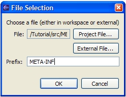 This dialog allows you to select which file (local to workspace or in the file system) to include in the package and to set a prefix which will be appended when building the package. | ![]() |