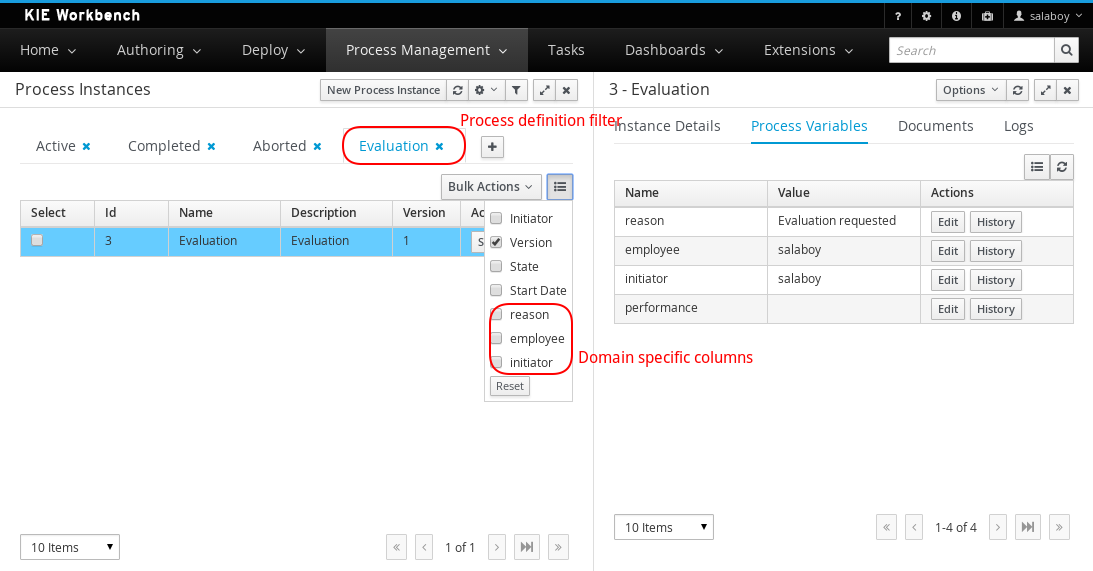 The user can now create a specific filter that provides domain specific columns to be added to a task list. When the user creates a custom filter for a specific task name the task variables are enabled as columns.