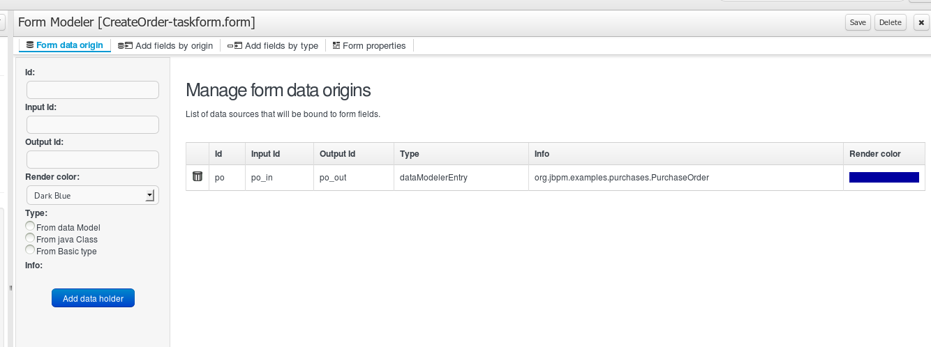 When the form has been generated automatically, this tab contain the process variables as data origins. This allow bind form fields with them, this relation it’s linked creating data bindings.